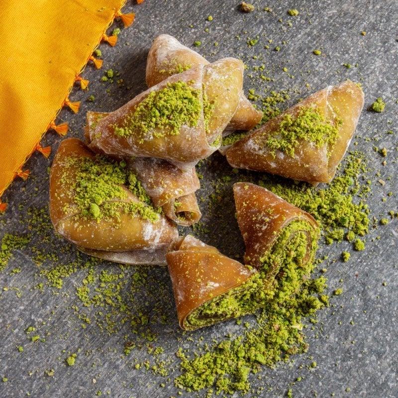 Savor the rich taste of Pistachio Muska, a traditional Turkish dessert handmade with layers of pastry and premium Antep pistachios.